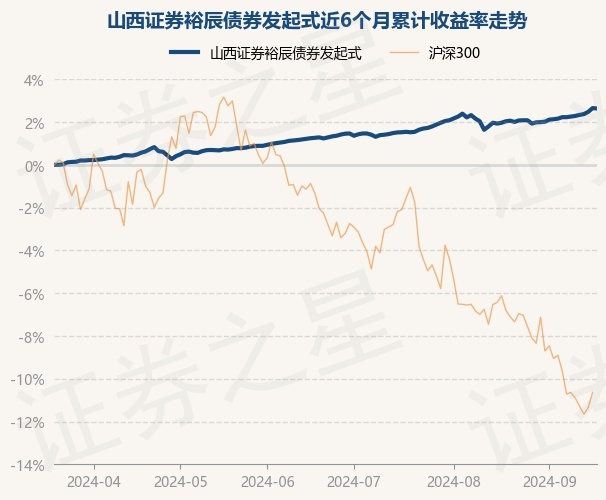证券之星消息,9月19日,山西证券裕辰债券发起式最新单位净值为1.0641元,累计净值为1.0941元,较前一交易日下跌0.02%。历史数据显示该基金近1个月上涨0.59%,近3个月上涨1.35%,近6个月上涨2.63%,近1年上涨6.26%。该基金近6个月的累计收益率走势如下图:
