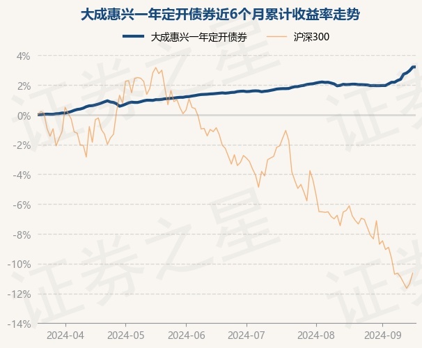 证券之星消息,9月19日,大成惠兴一年定开债券最新单位净值为1.0406元,累计净值为1.1621元,较前一交易日上涨0.01%。历史数据显示该基金近1个月上涨1.14%,近3个月上涨1.74%,近6个月上涨3.21%,近1年上涨5.92%。该基金近6个月的累计收益率走势如下图: