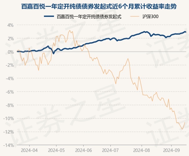 证券之星消息,9月19日,百嘉百悦一年定开纯债债券发起式最新单位净值为1.0448元,累计净值为1.0598元,较前一交易日下跌0.07%。历史数据显示该基金近1个月上涨0.36%,近3个月上涨1.24%,近6个月上涨2.9%,近1年上涨5.81%。该基金近6个月的累计收益率走势如下图: