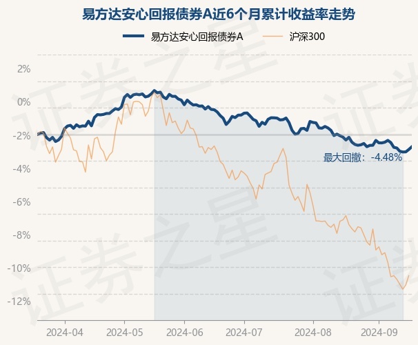 证券之星消息,9月19日,易方达安心回报债券A最新单位净值为1.8722元,累计净值为2.9712元,较前一交易日上涨0.2%。历史数据显示该基金近1个月下跌0.72%,近3个月下跌2.59%,近6个月下跌0.94%,近1年下跌0.79%。该基金近6个月的累计收益率走势如下图: