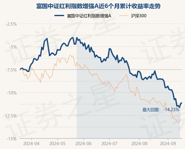 证券之星消息,9月19日,富国中证红利指数增强A最新单位净值为0.92元,累计净值为3.075元,较前一交易日上涨0.11%。历史数据显示该基金近1个月下跌6.98%,近3个月下跌9.8%,近6个月下跌7.26%,近1年下跌5.45%。该基金近6个月的累计收益率走势如下图: