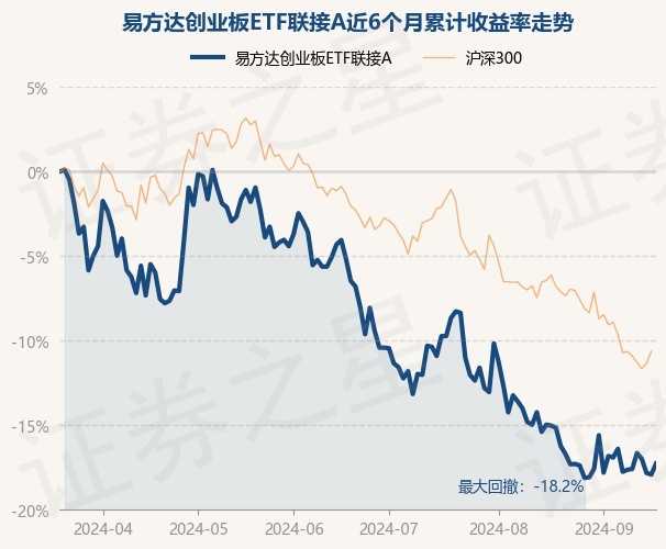 证券之星消息,9月19日,易方达创业板ETF联接A最新单位净值为1.6111元,累计净值为1.6111元,较前一交易日上涨0.79%。历史数据显示该基金近1个月下跌2.5%,近3个月下跌12.75%,近6个月下跌17.26%,近1年下跌21.67%。该基金近6个月的累计收益率走势如下图: