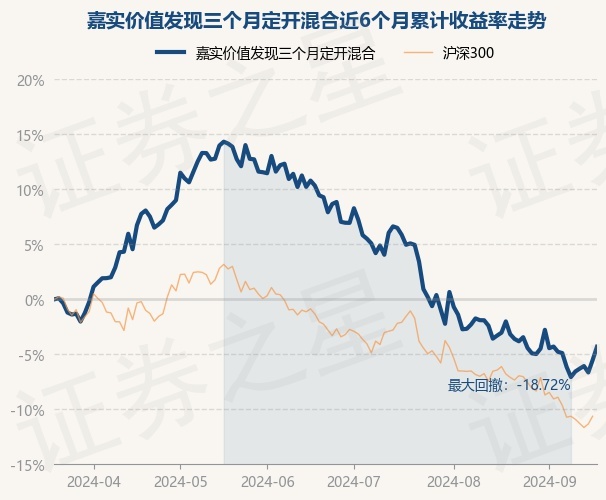 证券之星消息,9月19日,嘉实价值发现三个月定开混合最新单位净值为0.8416元,累计净值为0.9395元,较前一交易日上涨1.28%。历史数据显示该基金近1个月下跌2.36%,近3个月下跌13.28%,近6个月下跌4.32%,近1年下跌10.88%。该基金近6个月的累计收益率走势如下图:
