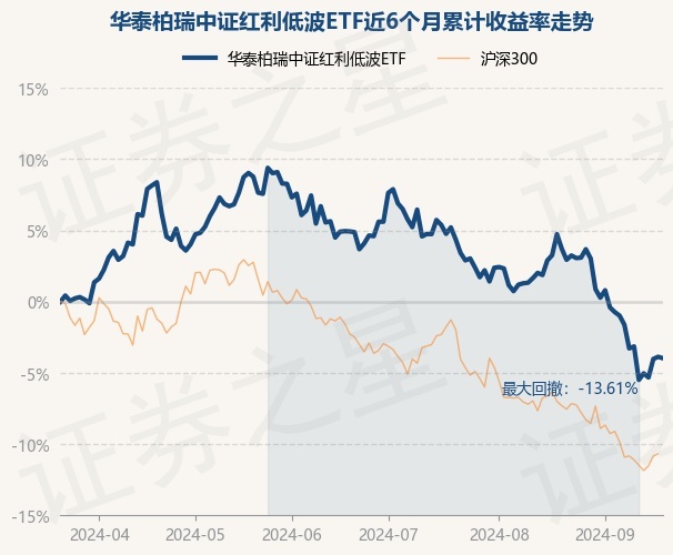 证券之星消息,9月20日,华泰柏瑞中证红利低波ETF最新单位净值为0.9599元,累计净值为1.9198元,较前一交易日下跌0.1%。历史数据显示该基金近1个月下跌7.42%,近3个月下跌8.49%,近6个月下跌3.97%,近1年上涨0.09%。该基金近6个月的累计收益率走势如下图: