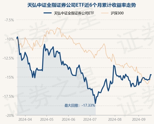 证券之星消息,9月20日,天弘中证全指证券公司ETF最新单位净值为0.7445元,累计净值为0.7445元,较前一交易日下跌0.05%。历史数据显示该基金近1个月上涨1.54%,近3个月下跌0.4%,近6个月下跌9.44%,近1年下跌14.26%。该基金近6个月的累计收益率走势如下图:
