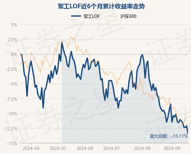 证券之星消息,9月20日,军工LOF最新单位净值为0.792元,累计净值为1.629元,较前一交易日下跌1.49%。历史数据显示该基金近1个月下跌5.15%,近3个月下跌9.49%,近6个月下跌13.44%,近1年下跌19.84%。该基金近6个月的累计收益率走势如下图: