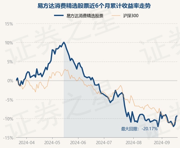 证券之星消息,9月20日,易方达消费精选股票最新单位净值为0.7254元,累计净值为0.7254元,较前一交易日上涨0.33%。历史数据显示该基金近1个月上涨1.88%,近3个月下跌9.32%,近6个月下跌9.28%,近1年下跌16.79%。该基金近6个月的累计收益率走势如下图: