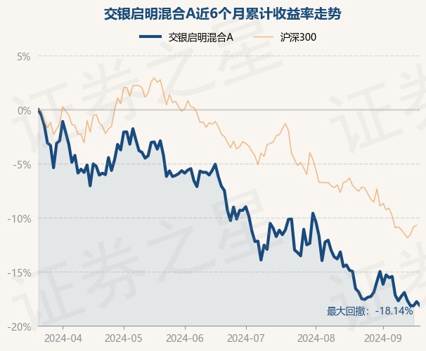 证券之星消息,9月20日,交银启明混合A最新单位净值为0.8961元,累计净值为1.0621元,较前一交易日下跌0.41%。历史数据显示该基金近1个月下跌1.84%,近3个月下跌11.86%,近6个月下跌18.09%,近1年下跌24.48%。该基金近6个月的累计收益率走势如下图: