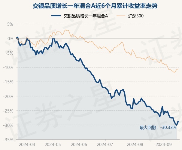 证券之星消息,9月20日,交银品质增长一年混合A最新单位净值为0.5642元,累计净值为0.5642元,较前一交易日下跌0.3%。历史数据显示该基金近1个月下跌5.84%,近3个月下跌17.5%,近6个月下跌29.03%,近1年下跌37.23%。该基金近6个月的累计收益率走势如下图:
