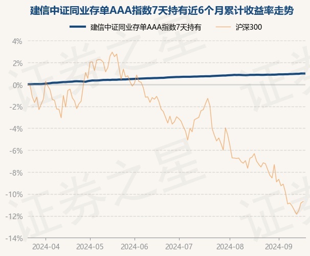 证券之星消息,9月20日,建信中证同业存单AAA指数7天持有最新单位净值为1.0456元,累计净值为1.0456元,较前一交易日上涨0.0%。历史数据显示该基金近1个月上涨0.11%,近3个月上涨0.39%,近6个月上涨0.99%,近1年上涨2.33%。该基金近6个月的累计收益率走势如下图: