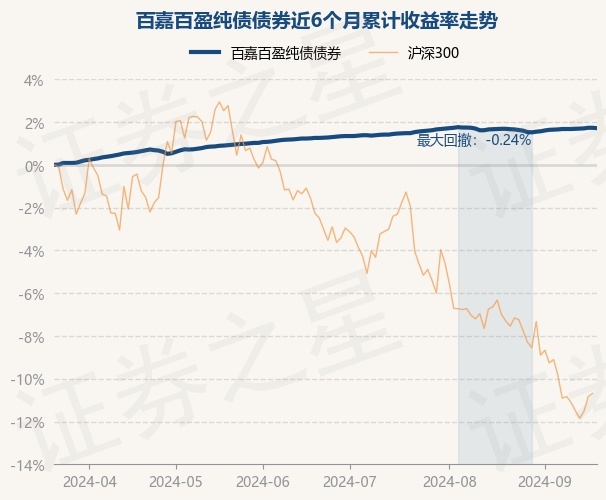 证券之星消息,9月20日,百嘉百盈纯债债券最新单位净值为1.0506元,累计净值为1.0506元,较前一交易日下跌0.02%。历史数据显示该基金近1个月上涨0.03%,近3个月上涨0.45%,近6个月上涨1.71%,近1年上涨3.66%。该基金近6个月的累计收益率走势如下图: