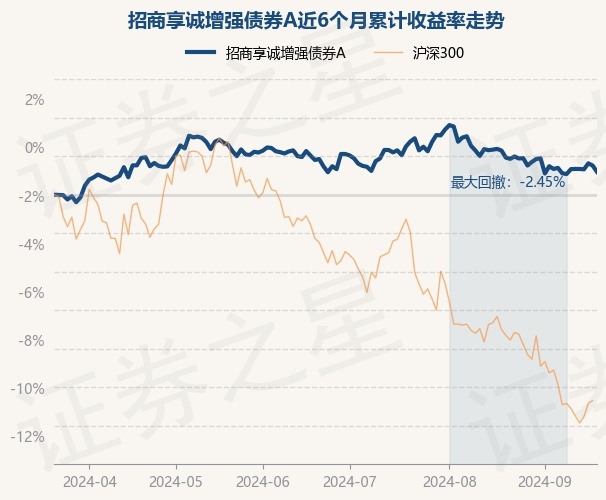 证券之星消息,9月20日,招商享诚增强债券A最新单位净值为1.0788元,累计净值为1.0788元,较前一交易日下跌0.32%。历史数据显示该基金近1个月下跌0.73%,近3个月下跌0.61%,近6个月上涨1.19%,近1年上涨3.68%。该基金近6个月的累计收益率走势如下图:
