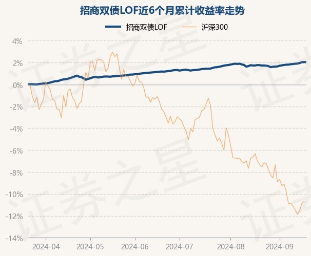 证券之星消息,9月20日,招商双债LOF最新单位净值为1.5698元,累计净值为1.7088元,较前一交易日上涨0.0%。历史数据显示该基金近1个月上涨0.27%,近3个月上涨0.85%,近6个月上涨2.03%,近1年上涨4.96%。该基金近6个月的累计收益率走势如下图: