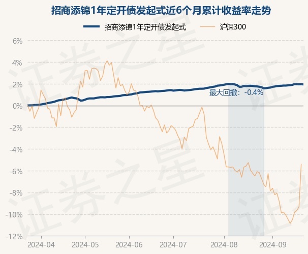 证券之星消息,9月23日,招商添锦1年定开债发起式最新单位净值为1.0524元,累计净值为1.1319元,较前一交易日上涨0.01%。历史数据显示该基金近1个月上涨0.23%,近3个月上涨0.65%,近6个月上涨1.96%,近1年上涨4.14%。该基金近6个月的累计收益率走势如下图: