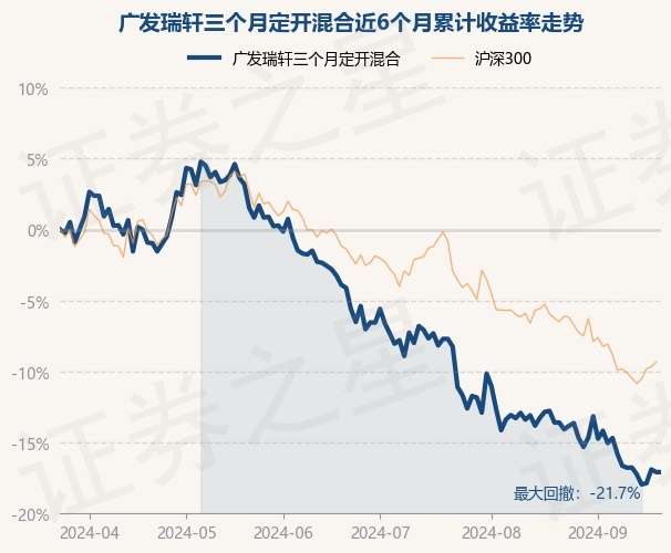 证券之星消息,9月23日,广发瑞轩三个月定开混合最新单位净值为0.4858元,累计净值为0.4858元,较前一交易日上涨0.0%。历史数据显示该基金近1个月下跌3.97%,近3个月下跌13.71%,近6个月下跌17.25%,近1年下跌26.77%。该基金近6个月的累计收益率走势如下图: