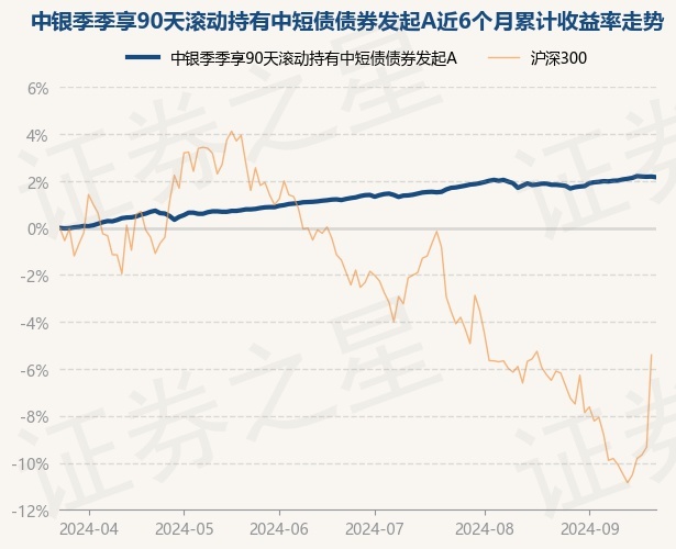 证券之星消息,9月23日,中银季季享90天滚动持有中短债债券发起A最新单位净值为1.0831元,累计净值为1.0831元,较前一交易日上涨0.01%。历史数据显示该基金近1个月上涨0.36%,近3个月上涨0.99%,近6个月上涨2.19%,近1年上涨4.79%。该基金近6个月的累计收益率走势如下图: