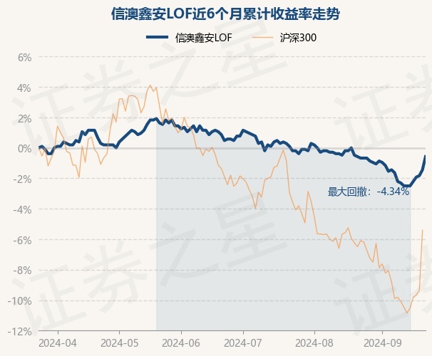 证券之星消息,9月24日,信澳鑫安LOF最新单位净值为1.034元,累计净值为1.361元,较前一交易日上涨0.88%。历史数据显示该基金近1个月上涨0.1%,近3个月下跌1.05%,近6个月下跌0.58%,近1年上涨1.77%。该基金近6个月的累计收益率走势如下图: