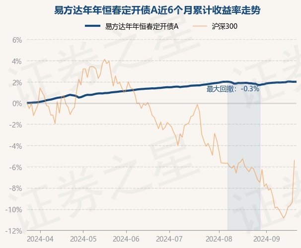 证券之星消息,9月24日,易方达年年恒春定开债A最新单位净值为1.0236元,累计净值为1.1401元,较前一交易日上涨0.0%。历史数据显示该基金近1个月上涨0.19%,近3个月上涨0.61%,近6个月上涨2.01%,近1年上涨4.33%。该基金近6个月的累计收益率走势如下图: