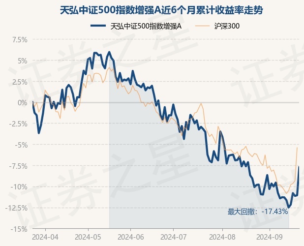 证券之星消息,9月24日,天弘中证500指数增强A最新单位净值为0.9665元,累计净值为0.9665元,较前一交易日上涨3.72%。历史数据显示该基金近1个月上涨2.31%,近3个月下跌6.32%,近6个月下跌7.75%,近1年下跌13.64%。该基金近6个月的累计收益率走势如下图: