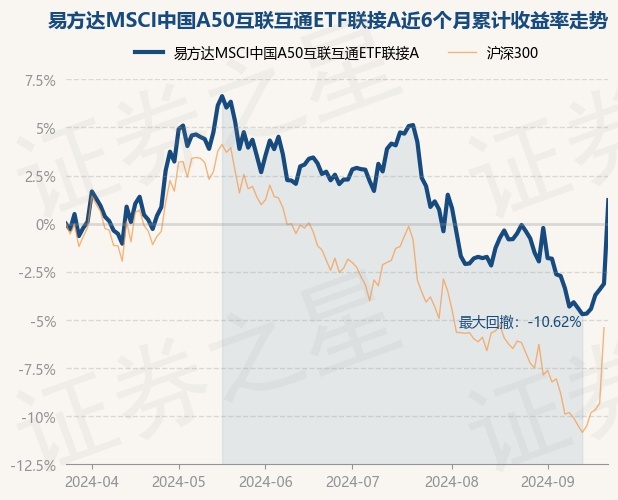 证券之星消息,9月24日,易方达MSCI中国A50互联互通ETF联接A最新单位净值为0.7687元,累计净值为0.7687元,较前一交易日上涨4.49%。历史数据显示该基金近1个月上涨1.29%,近3个月下跌1.44%,近6个月上涨1.22%,近1年下跌3.45%。该基金近6个月的累计收益率走势如下图: