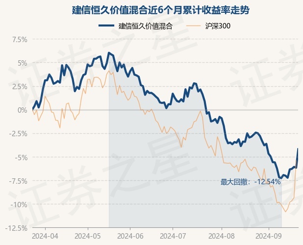证券之星消息,9月24日,建信恒久价值混合最新单位净值为0.8217元,累计净值为4.0174元,较前一交易日上涨2.1%。历史数据显示该基金近1个月下跌1.8%,近3个月下跌4.92%,近6个月下跌4.2%,近1年下跌5.44%。该基金近6个月的累计收益率走势如下图: