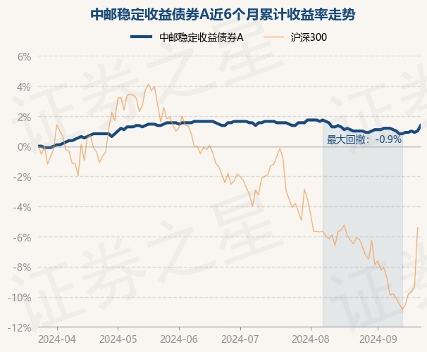 证券之星消息,9月24日,中邮稳定收益债券A最新单位净值为1.109元,累计净值为1.657元,较前一交易日上涨0.36%。历史数据显示该基金近1个月上涨0.36%,近3个月上涨0.0%,近6个月上涨1.37%,近1年上涨3.83%。该基金近6个月的累计收益率走势如下图: