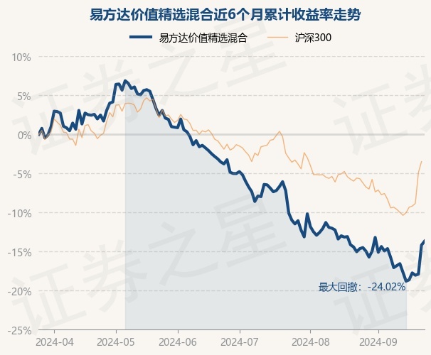 证券之星消息,9月25日,易方达价值精选混合最新单位净值为0.9847元,累计净值为3.6937元,较前一交易日上涨0.58%。历史数据显示该基金近1个月上涨1.12%,近3个月下跌10.29%,近6个月下跌13.68%,近1年下跌15.85%。该基金近6个月的累计收益率走势如下图: