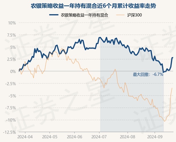证券之星消息,9月25日,农银策略收益一年持有混合最新单位净值为0.631元,累计净值为0.631元,较前一交易日上涨0.08%。历史数据显示该基金近1个月下跌1.65%,近3个月下跌1.85%,近6个月上涨2.8%,近1年上涨5.25%。该基金近6个月的累计收益率走势如下图: