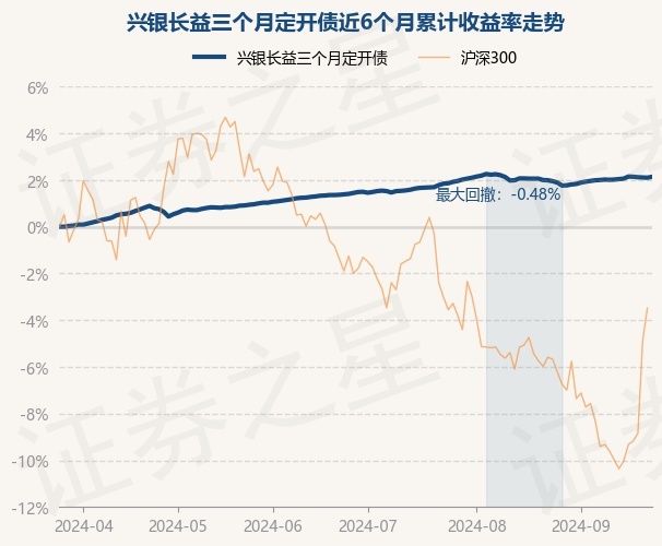 证券之星消息,9月25日,兴银长益三个月定开债最新单位净值为1.017元,累计净值为1.3229元,较前一交易日上涨0.04%。历史数据显示该基金近1个月上涨0.18%,近3个月上涨0.74%,近6个月上涨2.14%,近1年上涨4.42%。该基金近6个月的累计收益率走势如下图:
