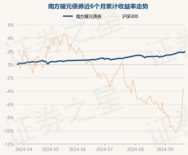 证券之星消息,9月25日,南方耀元债券最新单位净值为1.0231元,累计净值为1.0561元,较前一交易日上涨0.2%。历史数据显示该基金近1个月上涨0.73%,近3个月上涨1.16%,近6个月上涨1.97%,近1年上涨3.69%。该基金近6个月的累计收益率走势如下图: