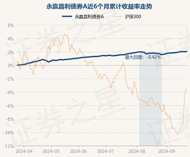 证券之星消息,9月25日,永赢昌利债券A最新单位净值为1.1202元,累计净值为1.1872元,较前一交易日上涨0.09%。历史数据显示该基金近1个月上涨0.34%,近3个月上涨0.75%,近6个月上涨2.09%,近1年上涨4.38%。该基金近6个月的累计收益率走势如下图: