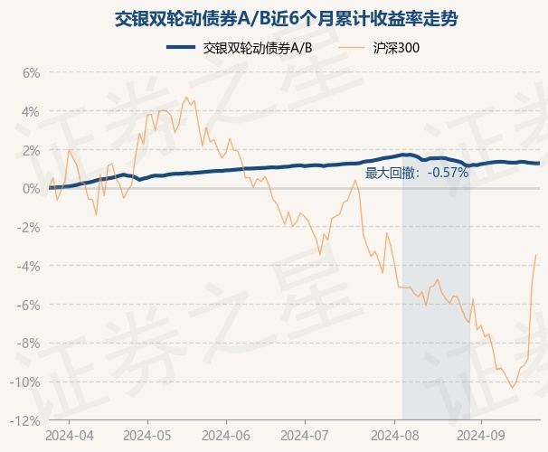 证券之星消息,9月25日,交银双轮动债券A/B最新单位净值为1.0845元,累计净值为1.5155元,较前一交易日上涨0.01%。历史数据显示该基金近1个月下跌0.1%,近3个月上涨0.18%,近6个月上涨1.27%,近1年上涨3.65%。该基金近6个月的累计收益率走势如下图: