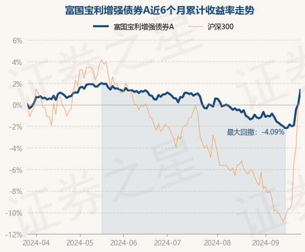 证券之星消息,9月26日,富国宝利增强债券A最新单位净值为1.2414元,累计净值为1.2814元,较前一交易日上涨1.31%。历史数据显示该基金近1个月上涨2.32%,近3个月上涨0.47%,近6个月上涨1.36%,近1年上涨0.48%。该基金近6个月的累计收益率走势如下图: