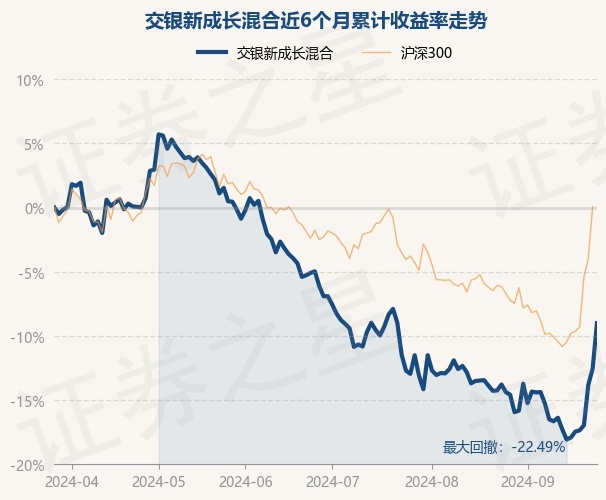 证券之星消息,9月26日,交银新成长混合最新单位净值为2.951元,累计净值为3.351元,较前一交易日上涨4.06%。历史数据显示该基金近1个月上涨6.27%,近3个月下跌4.25%,近6个月下跌9.0%,近1年下跌13.13%。该基金近6个月的累计收益率走势如下图: