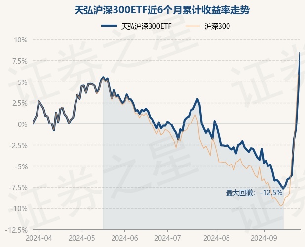 证券之星消息,9月27日,天弘沪深300ETF最新单位净值为1.0368元,累计净值为1.0368元,较前一交易日上涨4.54%。历史数据显示该基金近1个月上涨12.28%,近3个月上涨8.91%,近6个月上涨8.33%,近1年上涨2.57%。该基金近6个月的累计收益率走势如下图: