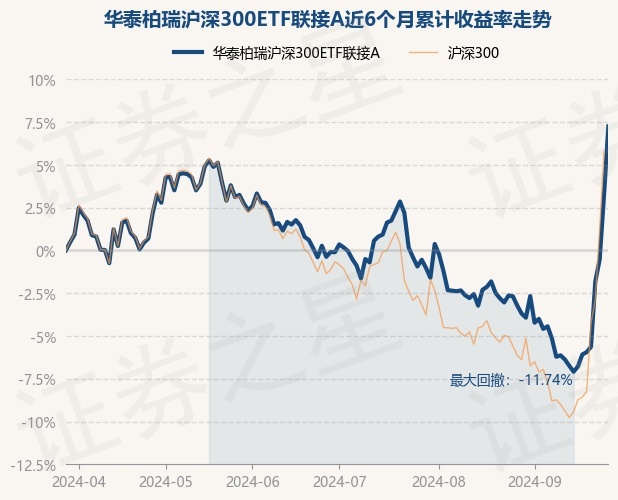 证券之星消息,9月27日,华泰柏瑞沪深300ETF联接A最新单位净值为0.9162元,累计净值为1.8292元,较前一交易日上涨3.91%。历史数据显示该基金近1个月上涨10.81%,近3个月上涨7.65%,近6个月上涨7.25%,近1年上涨1.8%。该基金近6个月的累计收益率走势如下图: