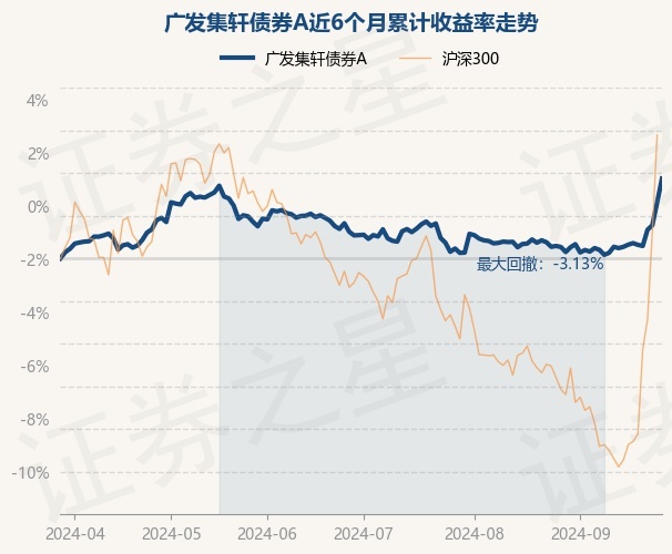 证券之星消息,9月27日,广发集轩债券A最新单位净值为1.0246元,累计净值为1.0246元,较前一交易日上涨1.09%。历史数据显示该基金近1个月上涨3.19%,近3个月上涨2.46%,近6个月上涨3.75%,近1年上涨3.13%。该基金近6个月的累计收益率走势如下图: