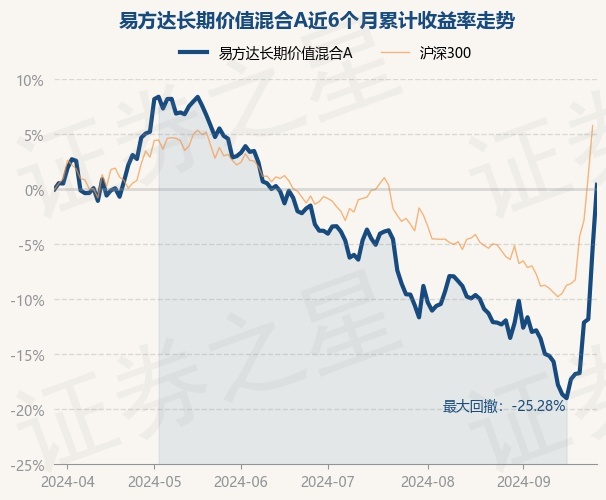 证券之星消息,9月27日,易方达长期价值混合A最新单位净值为0.8856元,累计净值为0.8856元,较前一交易日上涨6.09%。历史数据显示该基金近1个月上涨13.99%,近3个月上涨3.71%,近6个月上涨0.41%,近1年下跌0.63%。该基金近6个月的累计收益率走势如下图: