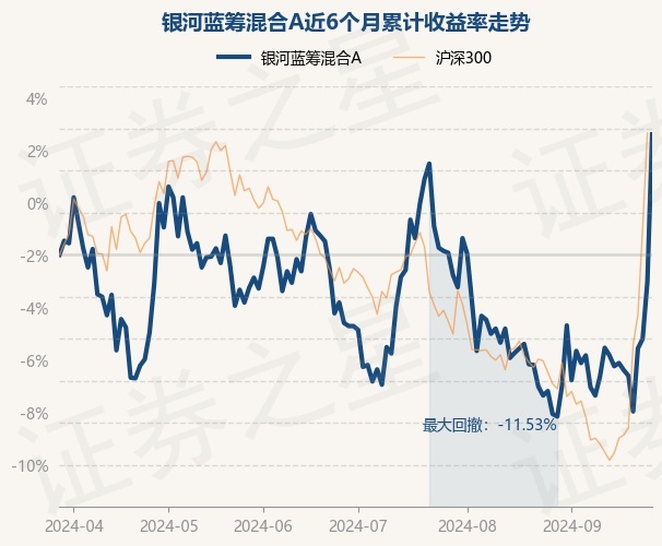证券之星消息,9月27日,银河蓝筹混合A最新单位净值为3.489元,累计净值为3.489元,较前一交易日上涨7.09%。历史数据显示该基金近1个月上涨14.39%,近3个月上涨9.27%,近6个月上涨5.73%,近1年下跌2.51%。该基金近6个月的累计收益率走势如下图: