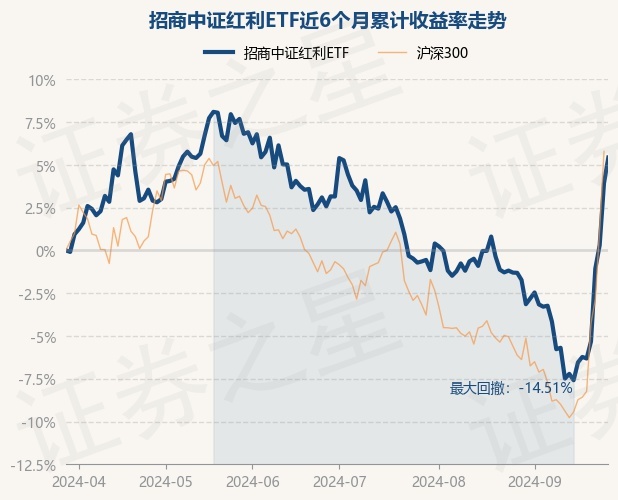 证券之星消息,9月27日,招商中证红利ETF最新单位净值为1.5188元,累计净值为1.8188元,较前一交易日上涨1.44%。历史数据显示该基金近1个月上涨6.83%,近3个月上涨2.75%,近6个月上涨5.4%,近1年上涨7.69%。该基金近6个月的累计收益率走势如下图: