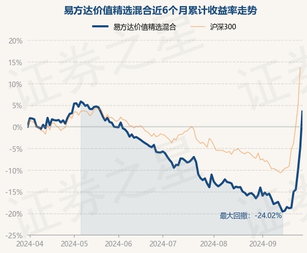 证券之星消息,9月30日,易方达价值精选混合最新单位净值为1.1925元,累计净值为3.9015元,较前一交易日上涨8.84%。历史数据显示该基金近1个月上涨20.43%,近3个月上涨10.06%,近6个月上涨3.51%,近1年上涨2.88%。该基金近6个月的累计收益率走势如下图: