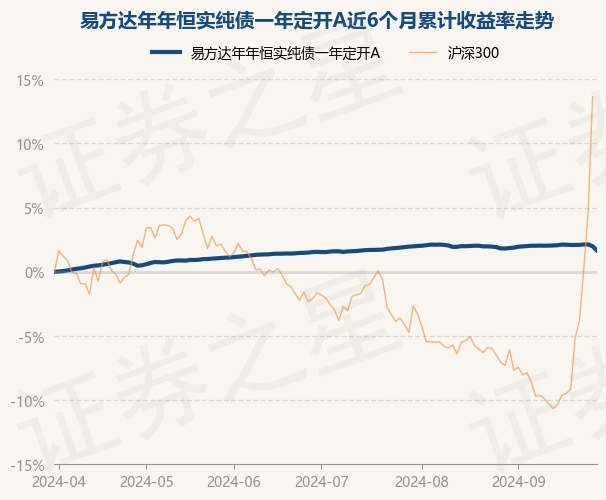 证券之星消息,9月30日,易方达年年恒实纯债一年定开A最新单位净值为1.0298元,累计净值为1.1477元,较前一交易日下跌0.33%。历史数据显示该基金近1个月下跌0.22%,近3个月上涨0.1%,近6个月上涨1.65%,近1年上涨4.17%。该基金近6个月的累计收益率走势如下图: