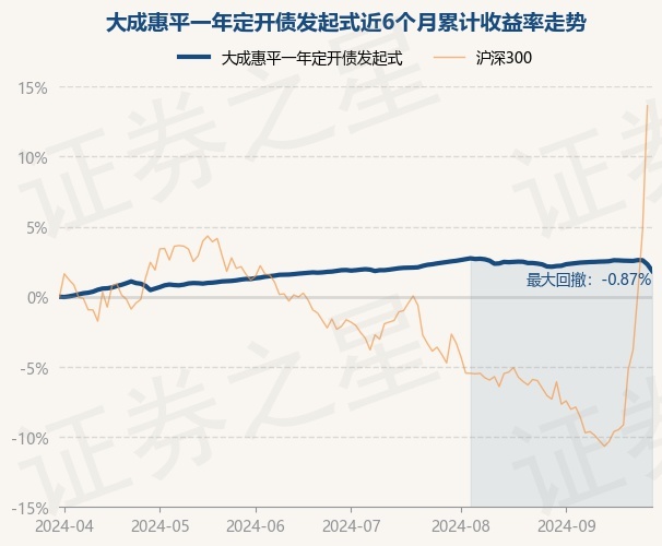 证券之星消息,9月30日,大成惠平一年定开债发起式最新单位净值为1.0339元,累计净值为1.1399元,较前一交易日下跌0.46%。历史数据显示该基金近1个月下跌0.36%,近3个月下跌0.06%,近6个月上涨1.85%,近1年上涨3.93%。该基金近6个月的累计收益率走势如下图: