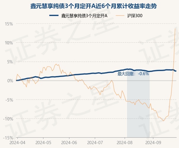 证券之星消息,9月30日,鑫元慧享纯债3个月定开A最新单位净值为1.0343元,累计净值为1.0513元,较前一交易日上涨0.0%。历史数据显示该基金近1个月下跌0.34%,近3个月上涨0.17%,近6个月上涨2.08%,近1年上涨5.08%。该基金近6个月的累计收益率走势如下图: