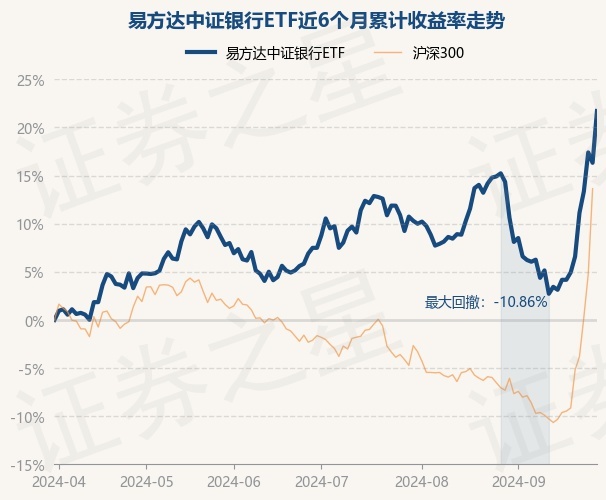 证券之星消息,9月30日,易方达中证银行ETF最新单位净值为1.1477元,累计净值为1.1477元,较前一交易日上涨4.63%。历史数据显示该基金近1个月上涨12.59%,近3个月上涨13.23%,近6个月上涨21.71%,近1年上涨26.05%。该基金近6个月的累计收益率走势如下图: