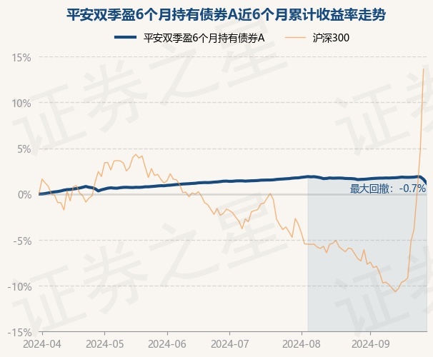 证券之星消息,9月30日,平安双季盈6个月持有债券A最新单位净值为1.11元,累计净值为1.11元,较前一交易日下跌0.42%。历史数据显示该基金近1个月下跌0.44%,近3个月下跌0.22%,近6个月上涨1.19%,近1年上涨3.37%。该基金近6个月的累计收益率走势如下图: