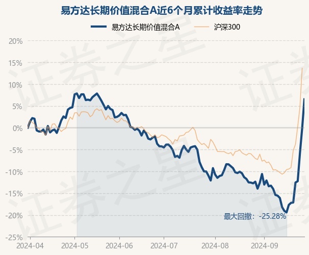 证券之星消息,9月30日,易方达长期价值混合A最新单位净值为0.9443元,累计净值为0.9443元,较前一交易日上涨6.63%。历史数据显示该基金近1个月上涨19.14%,近3个月上涨11.26%,近6个月上涨6.51%,近1年上涨6.7%。该基金近6个月的累计收益率走势如下图: