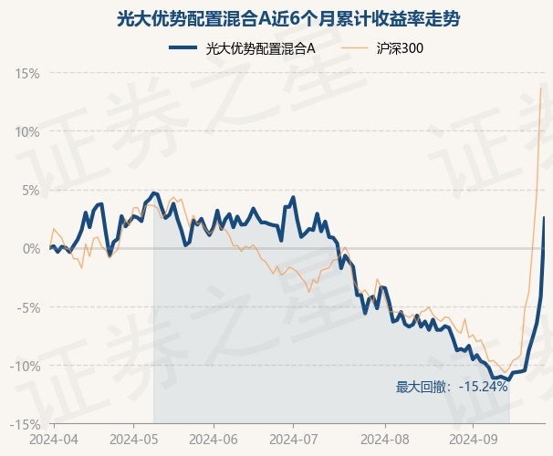 证券之星消息,9月30日,光大优势配置混合A最新单位净值为0.647元,累计净值为1.1062元,较前一交易日上涨6.98%。历史数据显示该基金近1个月上涨11.88%,近3个月下跌0.95%,近6个月上涨2.52%,近1年下跌2.57%。该基金近6个月的累计收益率走势如下图: