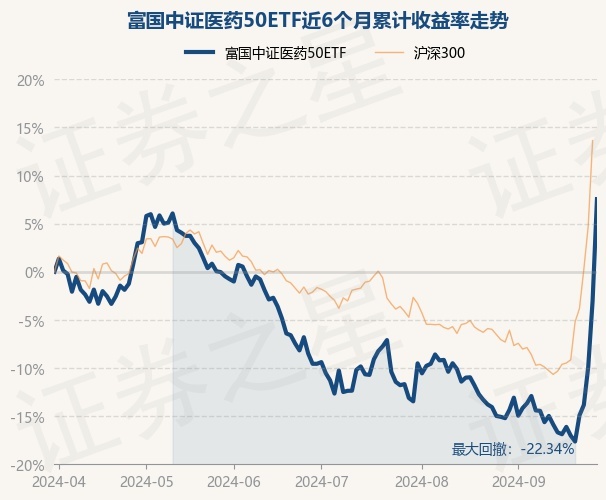 证券之星消息,9月30日,富国中证医药50ETF最新单位净值为0.9349元,累计净值为1.0619元,较前一交易日上涨10.91%。历史数据显示该基金近1个月上涨23.73%,近3个月上涨18.91%,近6个月上涨7.55%,近1年下跌7.44%。该基金近6个月的累计收益率走势如下图: