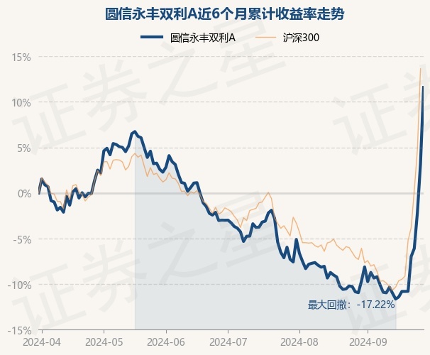 证券之星消息,9月30日,圆信永丰双利A最新单位净值为0.8414元,累计净值为2.6174元,较前一交易日上涨8.12%。历史数据显示该基金近1个月上涨21.43%,近3个月上涨15.02%,近6个月上涨11.58%,近1年上涨4.8%。该基金近6个月的累计收益率走势如下图: